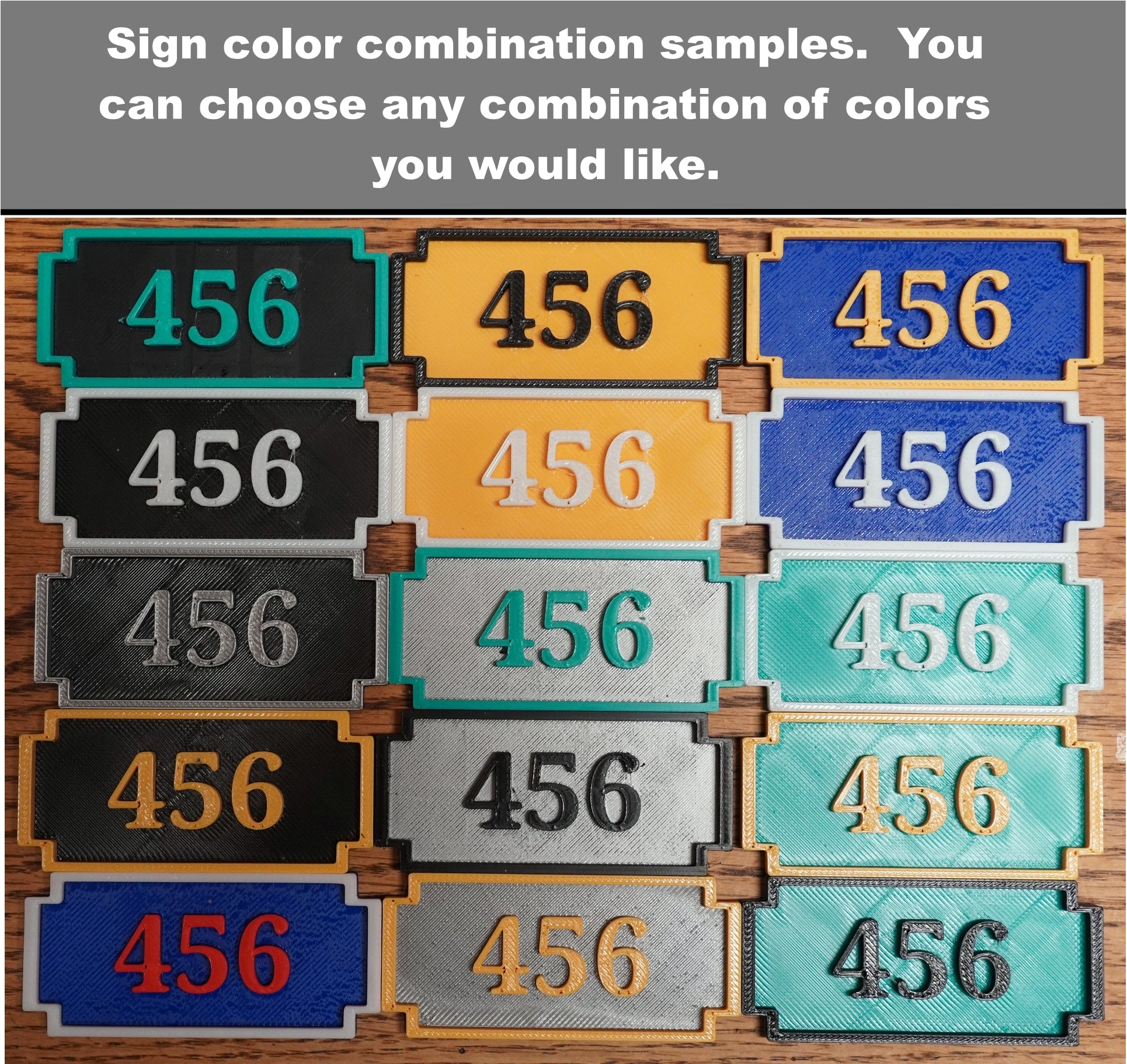 STANDARD INCLUDED COLORS- If you don't choose an optional color combination, you will receive your sign as shown in these examples with a blue base and white letters and outline. When choosing colors, the first color is the base color, the 2nd is the letters and the outline.